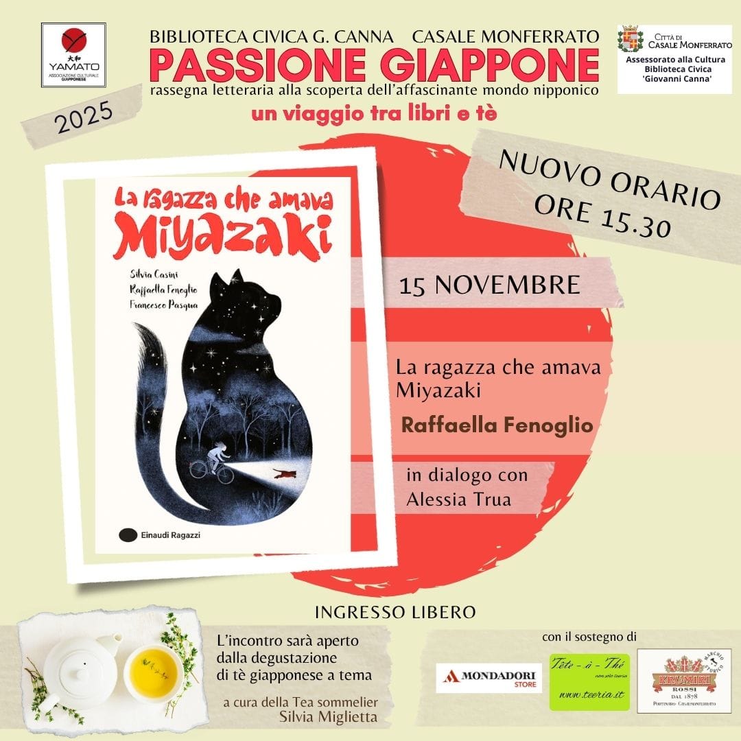 Come da tradizione, l’incontro sarà introdotto da una degustazione guidata di tè a cura della tea sommelier Silvia Miglietta e offerta dall’associazione Yamato. A seguire verrà presentato “La ragazza che amava Miyazaki”, opera di Raffaella Fenoglio, Silvia Casini e Francesco Pasqua che narra la storia di Sofia, giovane appassionata del regista Hayao Miyazaki, tra sogni, amicizia e avventure a Tokyo.