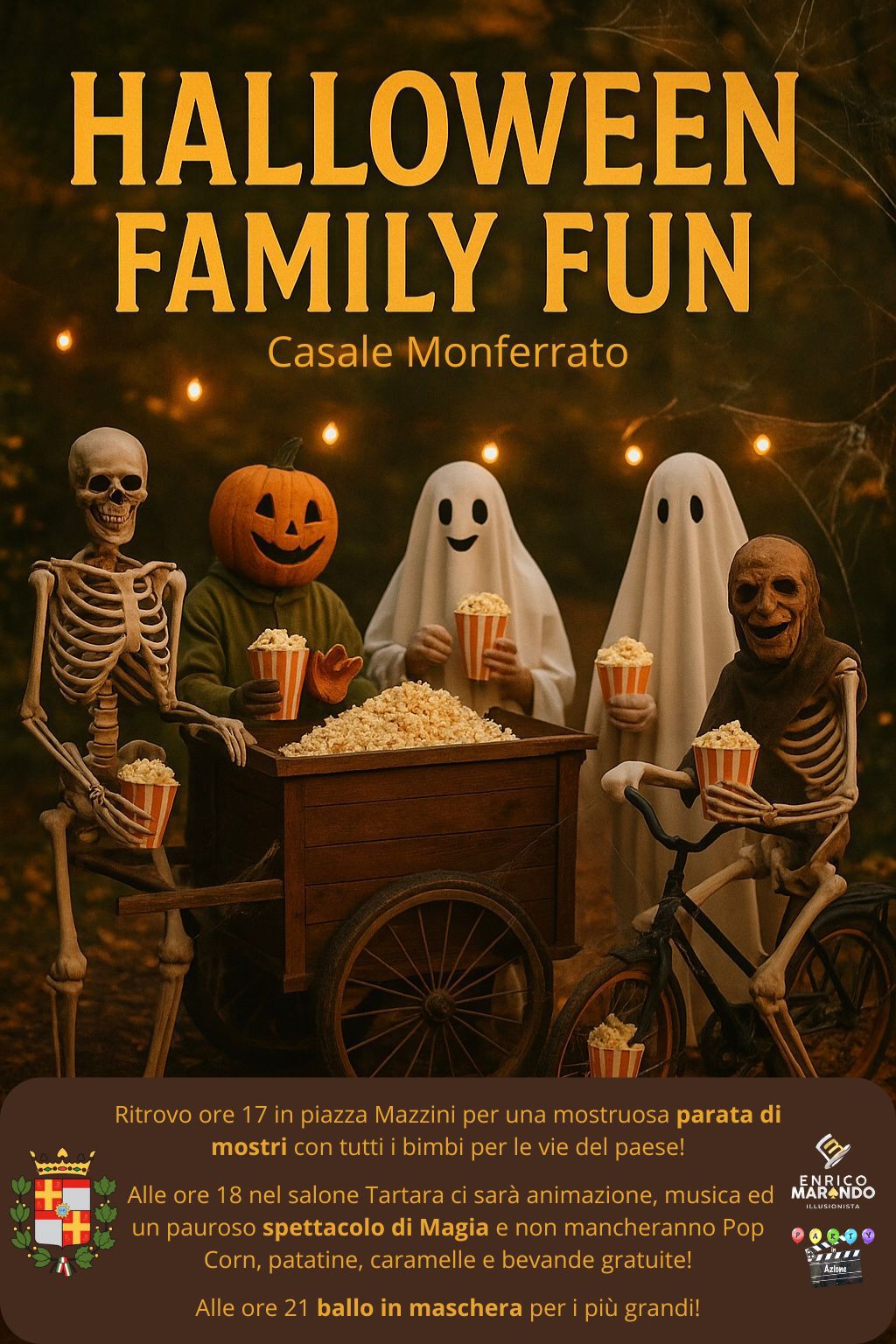 Dalle ore 18,30, al Salone Tartara di Piazza Castello, si terrà il “Family Magic Show”, uno spettacolo per tutte le età firmato dall’illusionista Enrico Marando, che unirà magia, comicità e coinvolgimento del pubblico in un’atmosfera suggestiva e “da brivido”. Durante la festa sarà attivo anche uno stand a tema che offrirà popcorn, patatine e bevande analcoliche, per rendere ancora più piacevole e golosa l’atmosfera di Halloween.