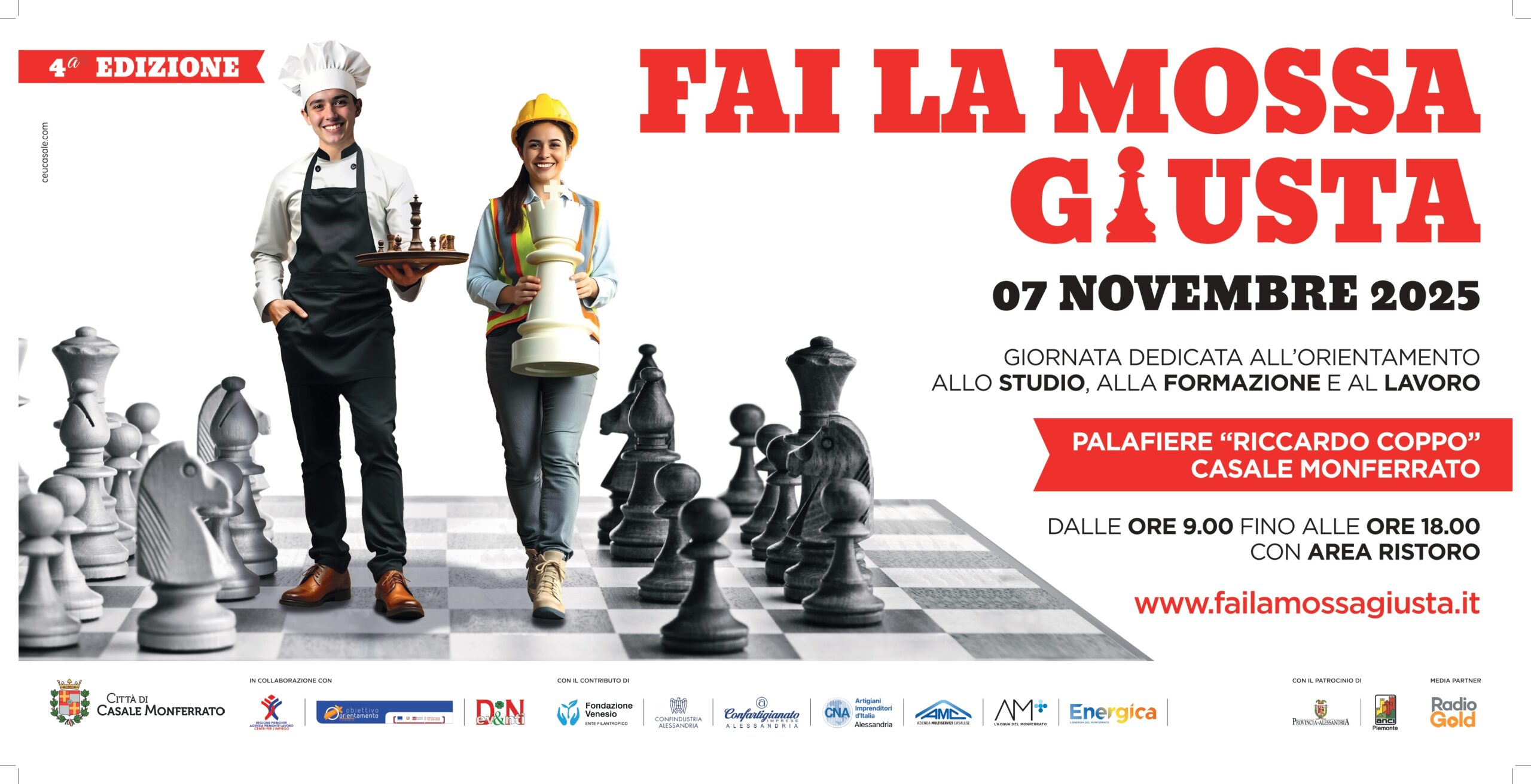 Venerdì 7 novembre 2025, dalle ore 9,00 alle ore 18,00 al Palafiere Riccardo Coppo di Casale Monferrato si terrà la IV edizione di Fai la Mossa Giusta, la giornata dedicata all’orientamento allo studio, alla formazione e al lavoro rivolta a studentesse e studenti della scuola secondaria di primo e secondo grado e agli adulti in cerca di occupazione o ricollocamento. Il mondo del lavoro, della scuola, della formazione professionale riuniti in un solo luogo per un solo giorno: licei, istituti tecnici, scuole professionali, istituti di formazione, università, aziende del turismo, commercio, artigianato, agricoltura, industria, agenzie per il lavoro, Forze dell’Ordine e Forze Armate.