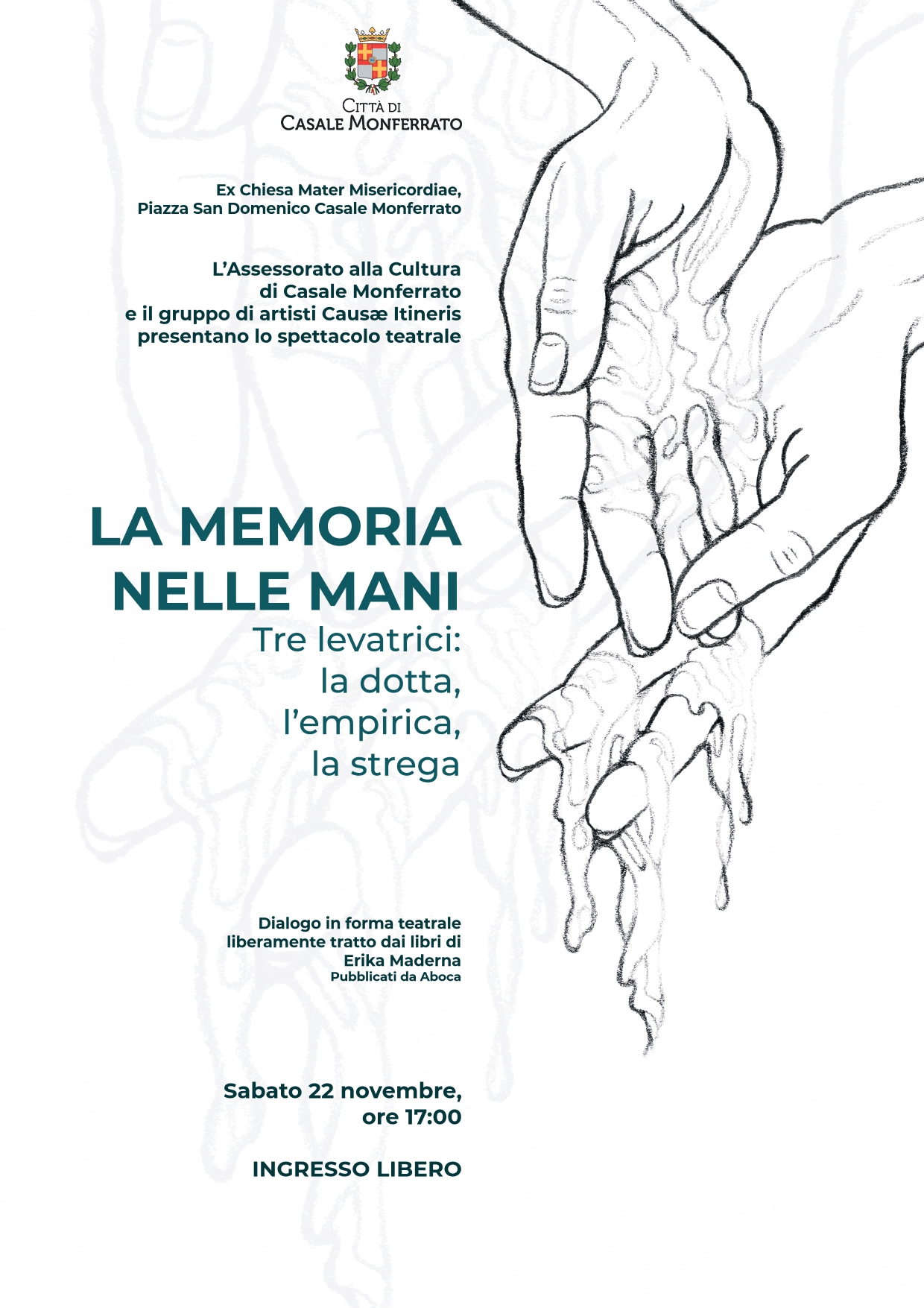 Sabato 22 novembre 2025 alle ore 17,00 presso la ex chiesa Mater Misericordiae di piazza San Domenico, a Casale Monferrato, andrà in scena “La memoria nelle mani. Tre levatrici: la dotta, l’empirica, la strega”, evento teatrale a cura del gruppo artistico Causae Itineris, realizzato con la collaborazione dell’Assessorato alla Cultura della Città di Casale Monferrato.