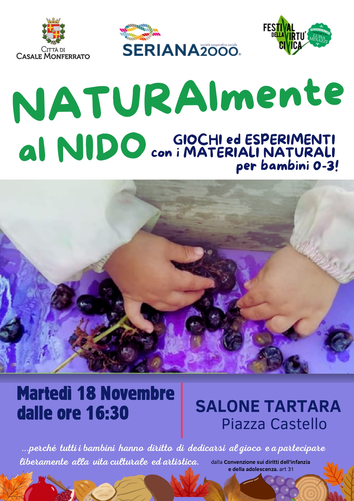 Martedì 18 novembre 2025 alle ore 16,30 presso il Salone Tartara, in Piazza Castello a Casale Monferrato si terrà NATURALmente al NIDO, iniziativa che rientra nell’ecosistema di laboratori proposti dal personale educativo dei Nidi d’infanzia Oltreponte, Porta Milano e Valentino, inseriti nel “Festival della Virtù civica”: uniti dal comune intento di portare proposte coerenti con le progettualità educative dei nidi e con i temi inerenti il Festival, nella ferma convinzione che una comunità si educhi insieme e a partire dai più piccoli.