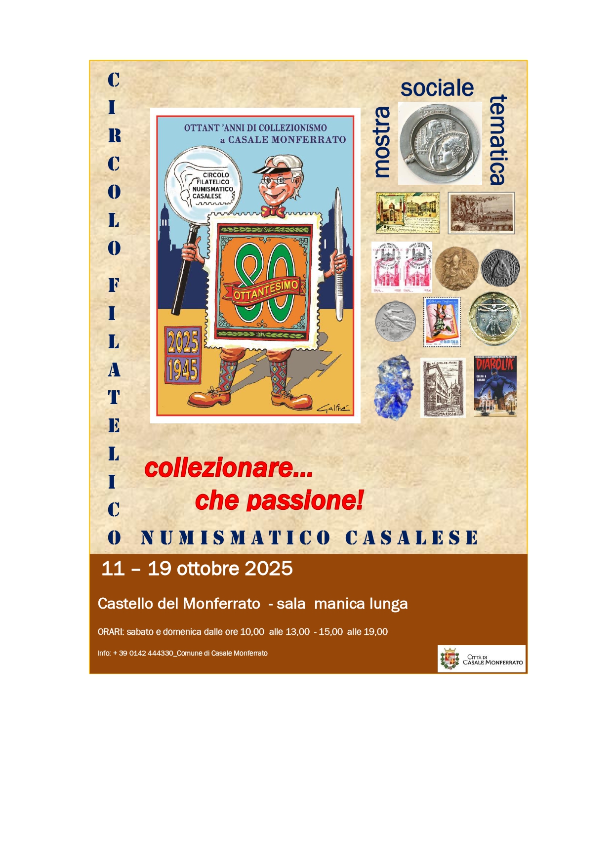 La Mostra Sociale, infatti, offrirà al pubblico una panoramica ricca e variegata del collezionismo. Tra le esposizioni principali: filatelia e storia postale, numismatica, cartoline storiche, collezioni varie e moderne. Tra i temi presentati vi saranno “Per non dimenticare™”, “Medaglistica Casalese”, “Monete e Medaglie di Crea”, “Francobolli dei servizi della Repubblica™”, “Casale in Cartolina™”, “Paleologi — documenti dal 1461 al 1565”, oltre a collezioni di minerali, gettoni, tappi di spumante e Pokémon.
