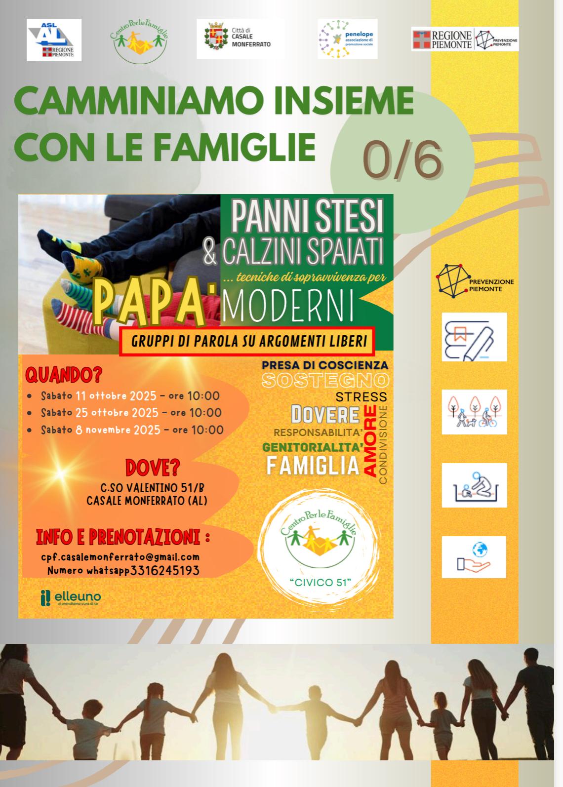 Sabato 11 ottobre alle ore 10,00 al Centro per le Famiglie “Civico 51” di corso Valentino 51/B, prosegue l’iniziativa del ciclo “Camminiamo insieme con le famiglie 0/6” dal titolo “Panni stesi e calzini spaiati: tecniche di sopravvivenza per papà moderni”, una serie di incontri dedicati ai padri: tre appuntamenti di gruppi di parola su argomenti liberi, pensati come momenti di confronto, scambio di esperienze e condivisione tra genitori.