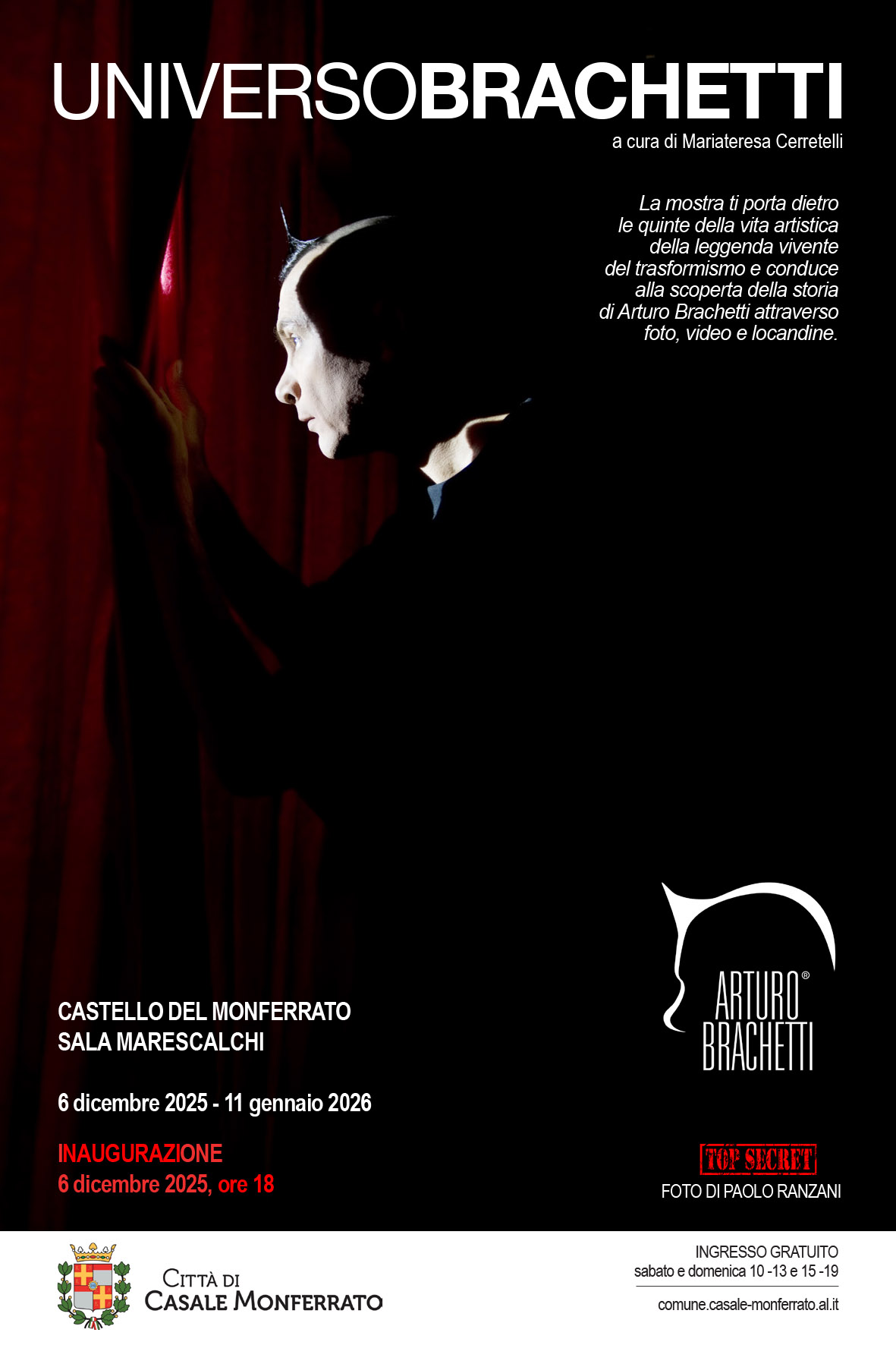 Sabato 6 dicembre 2025 alle ore 18,00 nel Salone Marescalchi del Castello del Monferrato, aprirà al pubblico “UniversoBrachetti”, un percorso espositivo curato da Mariateresa Cerretelli, dedicato alla straordinaria carriera del Maestro della visual performing art, Arturo Brachetti, che sarà, inoltre, protagonista al Teatro Municipale di Casale Monferrato con il one man show “Solo”, martedì 9 e mercoledì 10 dicembre 2025.